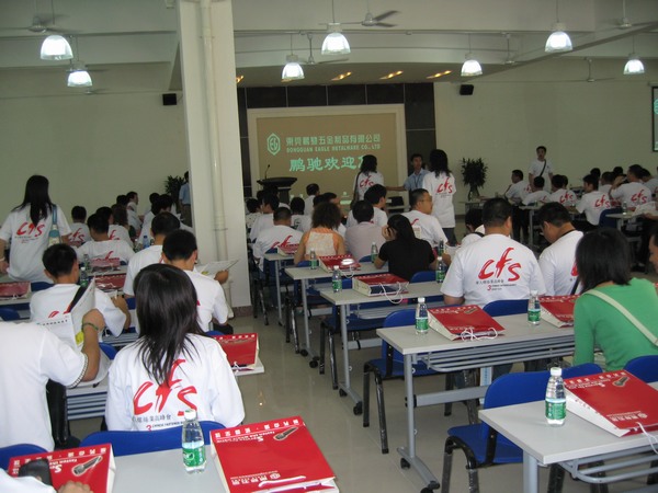 从参访团进入鹏驰大门,沿路都有员工列队欢迎并做路线指引,规律、整齐;进入会议厅之后,也有相关人员指引嘉宾就座,井然有序……员工的细心、训练有素,参访团的嘉宾对此十分满意。周董代表鹏驰上台欢迎参访团的到来,并表示鹏驰今后会更加努力,做到更好。鹏驰一向秉承周董雷厉风行的作风,致欢迎词,简短中透着热情;播宣传片,精美中沁出专业。